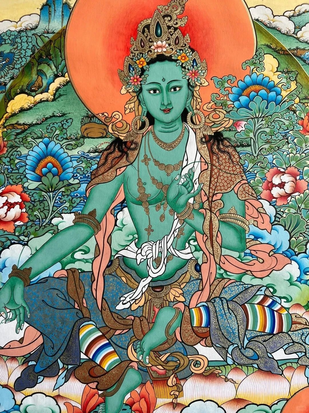 - Vitality & Healing: Her emerald green color symbolizes life, growth, and renewal—like the first buds of spring breaking through the snow. She is associated with physical and emotional healing, helping to release grief, anxiety, and stagnation, and restoring balance to the body and mind. A Green Tara Thangka displayed in your home can infuse your space with calming, revitalizing energy.