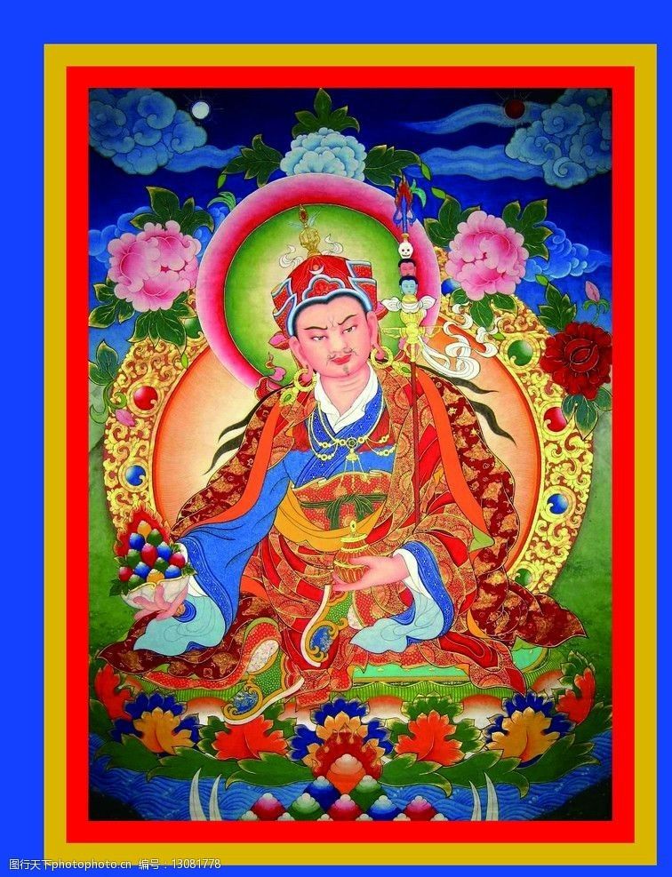 Born from a lotus in Uddiyana, he was invited to Tibet in the 8th century to spread Buddhism, built Samye Monastery, and integrated local beliefs. Thangkas depict him with a vajra, skull cup and staff, representing his power to subdue demons and enlighten beings.