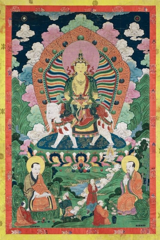 He forms the "Avataṃsaka Trinity" with Vairocana Buddha and Manjushri. Depicted riding a six-tusk white elephant (symbolizing great vows), he holds a lotus or ruyi. Revered for his "Ten Great Vows", his faith spread widely with Mount Emei as his Taoist site, representing the unity of wisdom and practice.