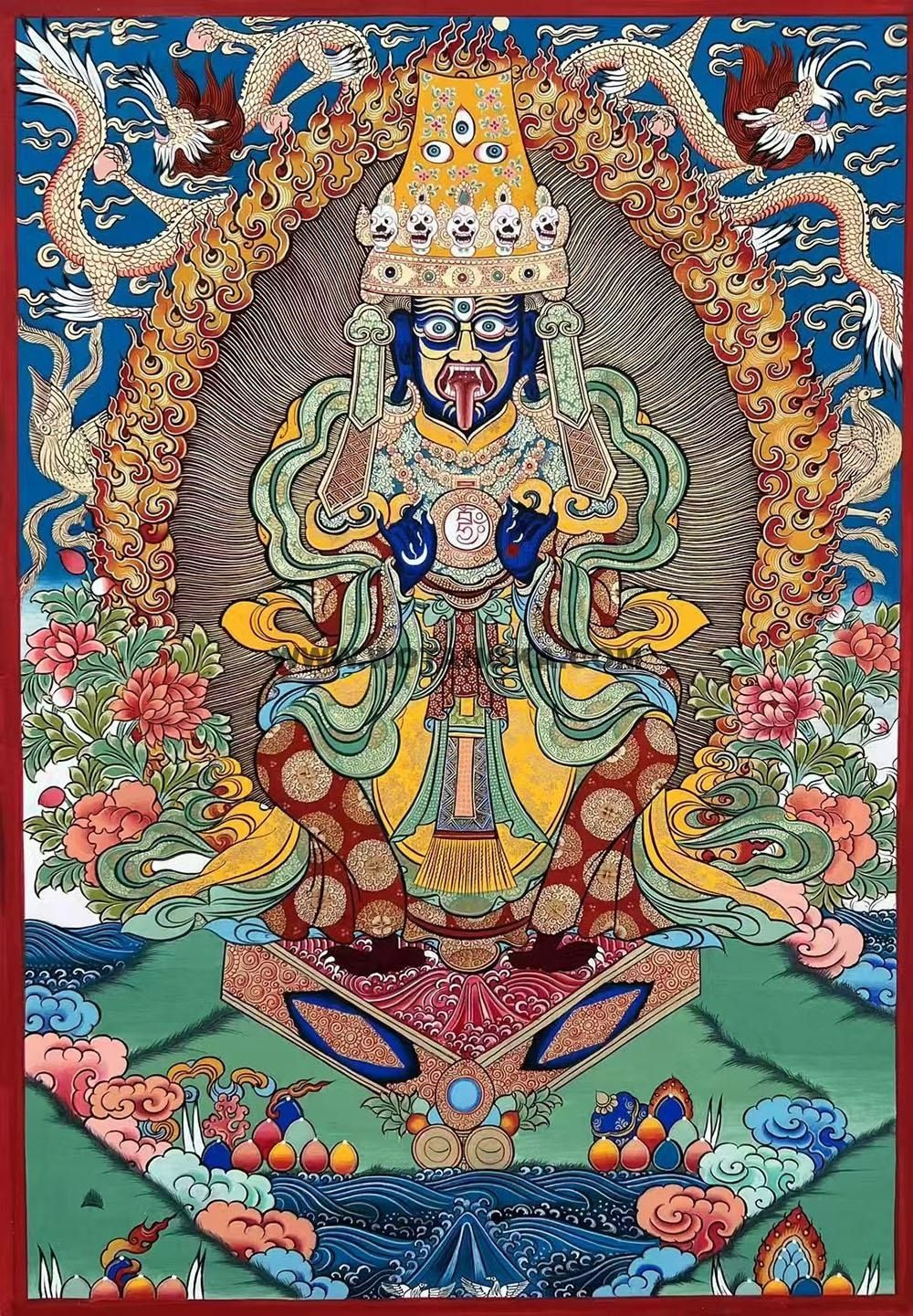 Zashi Lhamo (Tibetan: "གྲ་བཞི་ལྷ་མོ"), the main female Dharma protector of Lhasa's Zashi Temple, is a renowned female god of wealth in Tibetan Buddhism. As a classic thangka theme symbolizing fortune and protection, it’s ideal for enshrinement and collection, embodying wishes for prosperity and evil warding.